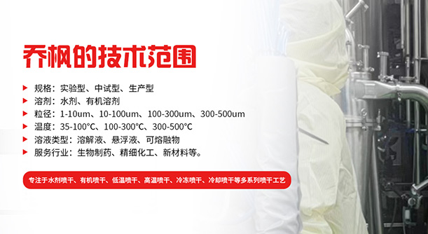 上海喬楓實業有限公司,成立于2012年,是從事噴霧干燥設備的研發設計、生產、銷售(小型噴霧干燥機,實驗型噴霧干燥機,35℃低溫噴霧干燥機有機溶劑噴霧干燥機低溫閉式循環噴霧干燥機、超細粉末噴霧干燥機、噴霧冷凍干燥機、真空噴霧干燥機、氣流噴霧干燥機,噴霧造粒干燥機,離心噴霧干燥機,沸騰制粒機等)和售后于一體的綜合性公司,本公司現成為一家致力于為生物制藥、精細化工、新能源、陶瓷造粒及食品工程等領域提供全套解決方案的整線交鑰匙工程企業。